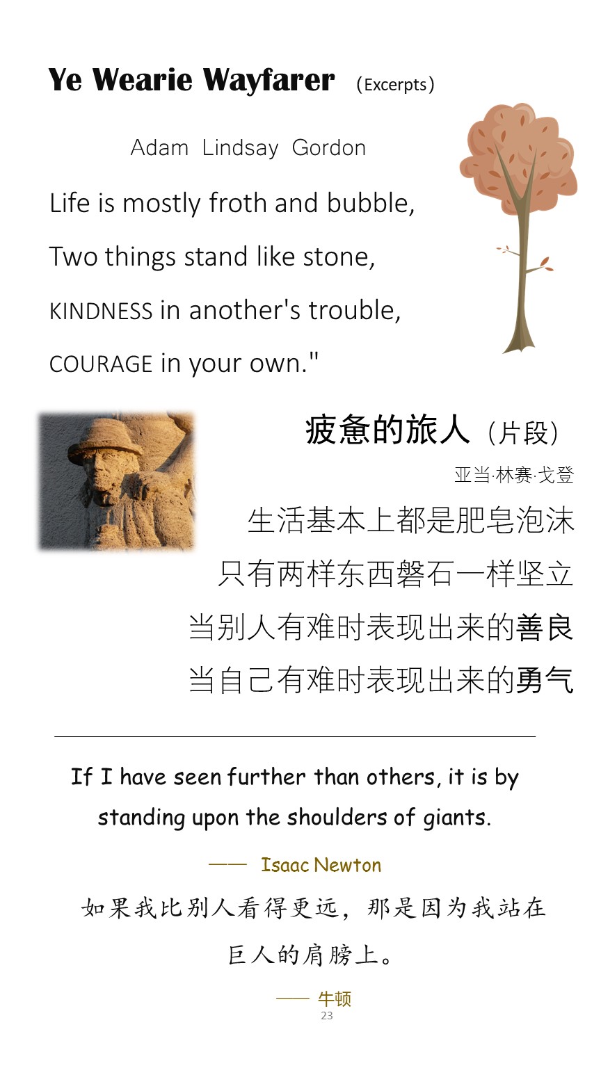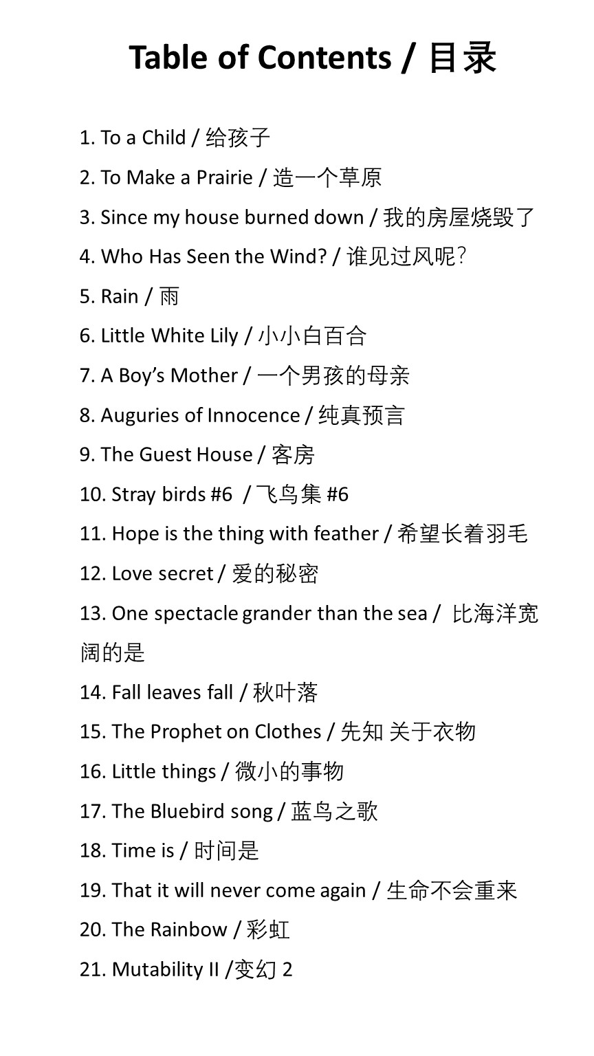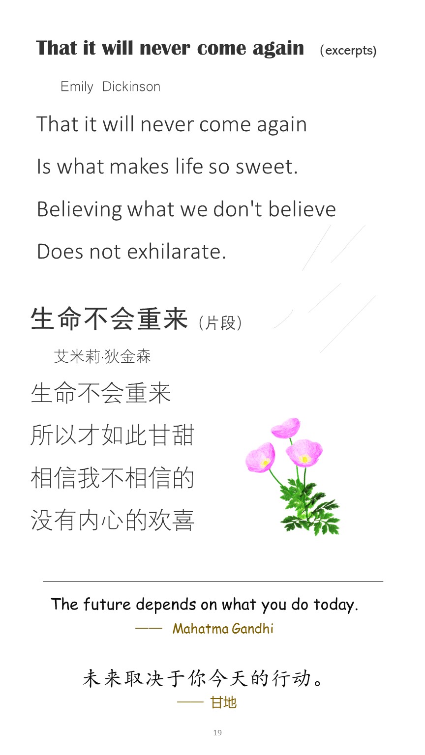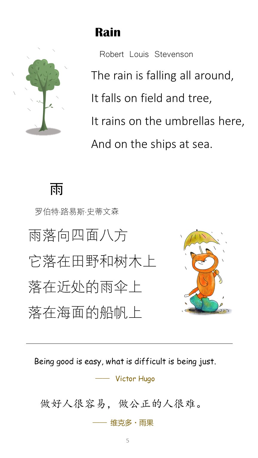 Classical English poems that are short in length and everlasting in beauty are now available in English-Chinese bilingual versions. Selected and Translated by Slow Rabbit, these bilingual poems will nourish the growing mind of children and help them learn both languages at the same time. The book also includes some inspiring and thought provoking quotations. This book is suitable for children of all ages, especially 8 and above. Even adults can benefit from reading these poems and quotations