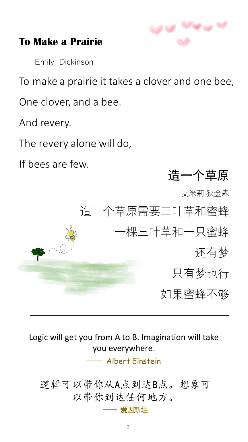 《给孩子们的双语格言诗》精选了适合6-12岁儿童阅读的经典英文诗(片段),及40几个简洁而深刻的英文格言,精心翻译成中文。这些双语格言诗不仅可以帮助孩子学习中英文语言,而且可是通过这些经典的诗格言,滋养他们的心灵,帮助他们培养积极的人生观和优美的语言美感。